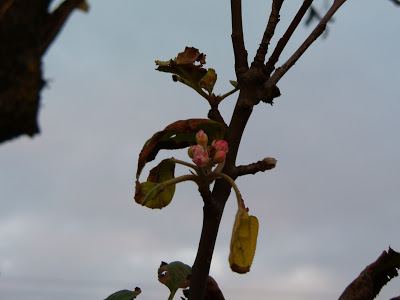 Er hat noch Blätter, friert vielleicht ein wenig,den es ist dort eine sehr „zugige Ecke“ aber er blüht noch! Jetzt haben auch untere Äste neue Blütenknospen…