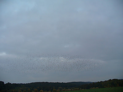 Kurz bevor ich beim Apfelbaum war, flog ein großer Schwarm Vögel blitzschnell im Tiefflug über die Straße. Der Vogelschwarm ließ sich auf dem Feld nieder, um kurz darauf wieder im Tiefflug über die Straße zurück zu fliegen. Ich bremste vorsichtshalber ab. Was war das? Mein erster Gedanke: ein großer Mückenschwarm – dafür waren jedoch die „Flugobjekte“ zu groß!