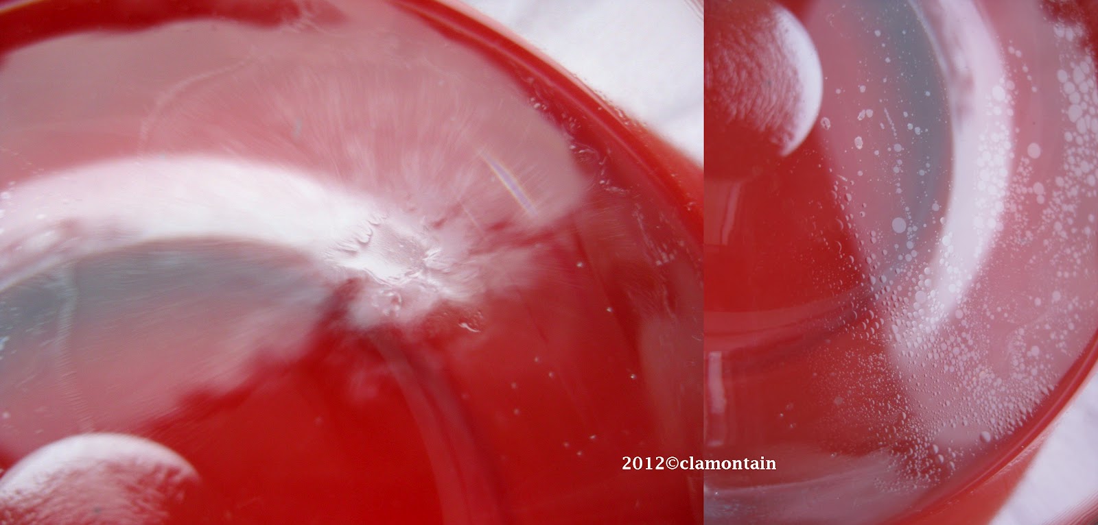 Ich tropfte 1Tr. ÄÖ ins Wasser (s. Eintropfstelle). Blitzartig bildete sich eine schillernde Farbfahne mit interessanten (Blatt)Mustern und der Tropfen zog hoch auf Position. Die Farbfahne hatte sich sofort wieder aufgelöst und nun bewegte sich der Tropfen. Er wandelte die Formen und bildete kleine Löcher in dem zusammenhängenden Film des ÄÖ. Insgesamt dauerte dieser gesammte Vorgang ganze 2 Minuten.