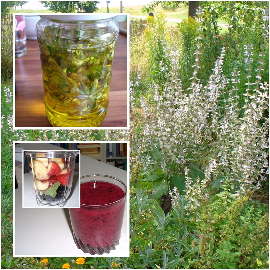 Die Muskatellersalbei-Staude in voller Pracht, das Mazerat und der Smoothie