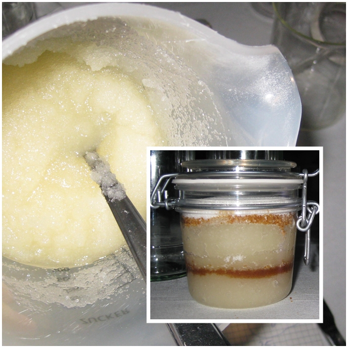 Das Zuckerpeeling wurde aus weißen und braunen Zucker (prüfen, ob desen Eigengeruch passt) und Mandelöl hergestellt und jetzt natürlich unbedingt mit dem Schokoduft…