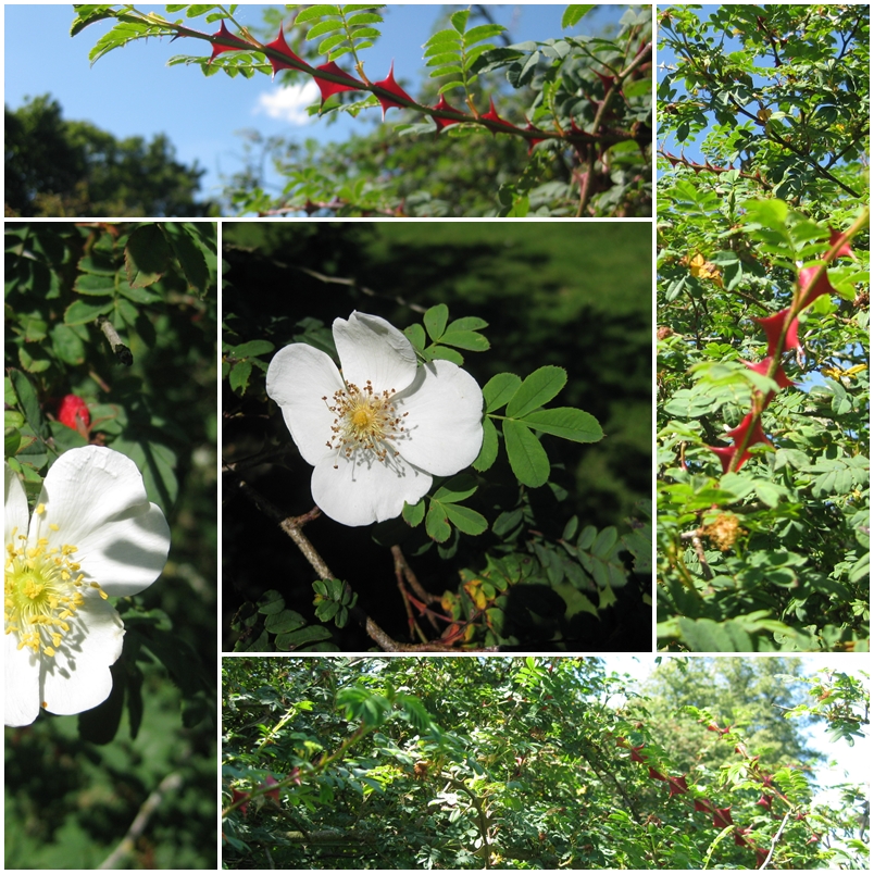 roten Stacheln und ihren unscheinbaren vierblättrigen reinweißen Blüten –