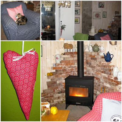 Es gibt einen kleinen „Königin-Stuhl“ mit rotem Samtpolster. Es gibt ein Sammelsurium an Stühlen und Ohrensessel neben dem Kamin-Ofen
